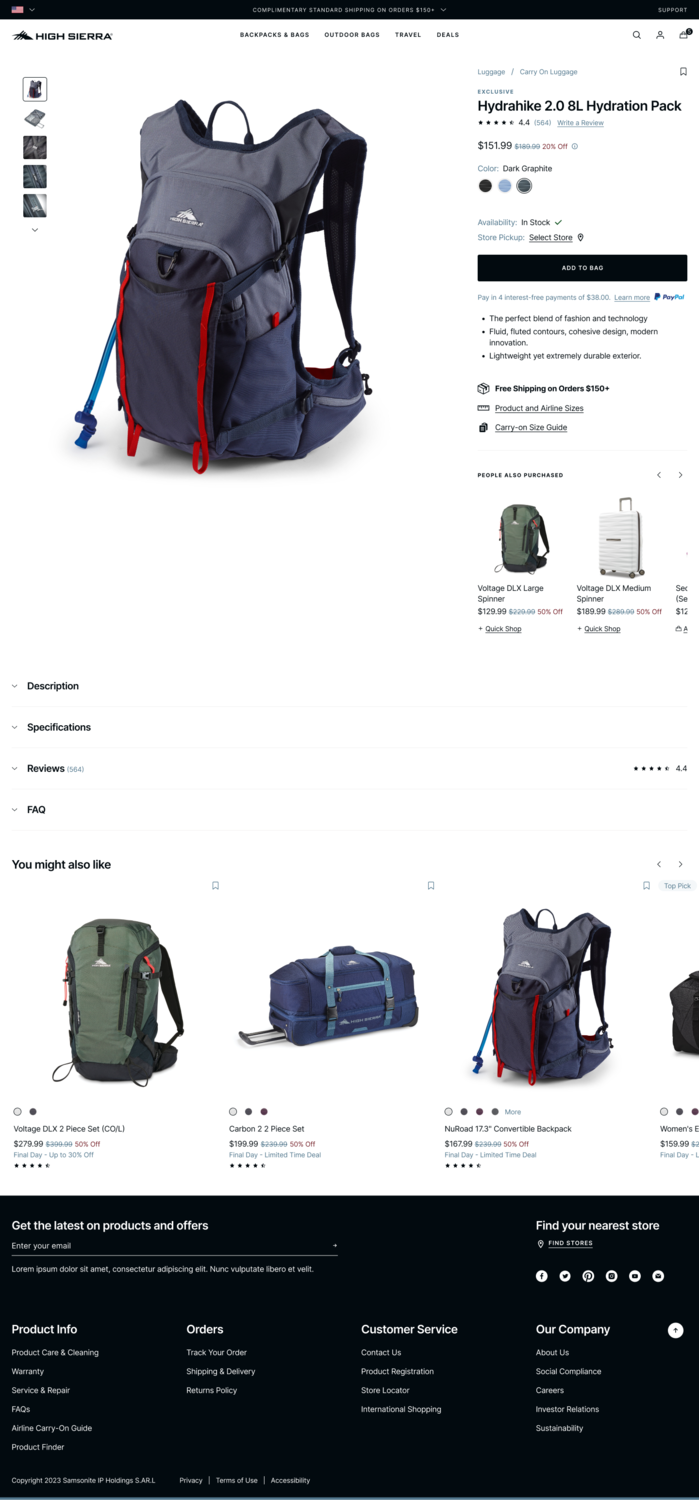 In our project with High Sierra, a brand renowned for its adventurous and durable outdoor gear under the Samsonite portfolio, we assumed the roles of Architect and Tech Lead. Our objective was to create an online platform that reflects High Sierra's rugged and adventurous spirit. Leveraging advanced technologies such as Salesforce Commerce Cloud, Google Tag Manager, and Cybersource, our collaboration with High Sierra's in-house marketing team was pivotal. We focused on developing an e-commerce site that not only appeals to the outdoor enthusiasts but is also top-notch in functionality and ease of use.